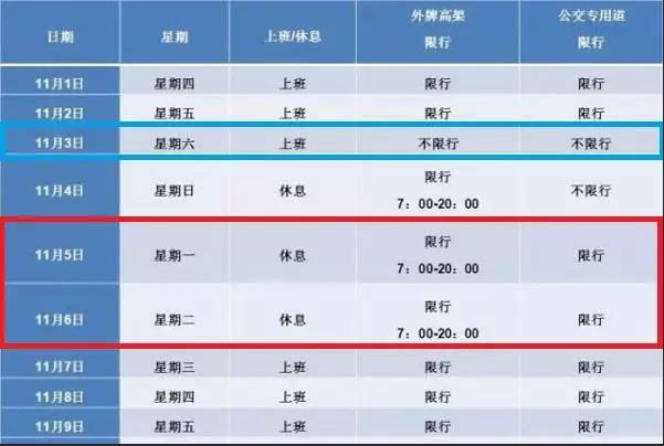 是不是一目了然了,五日和六日两天虽然调休为休息日,但是高架道路和公交车道仍旧对外牌车是实行限行措施的。